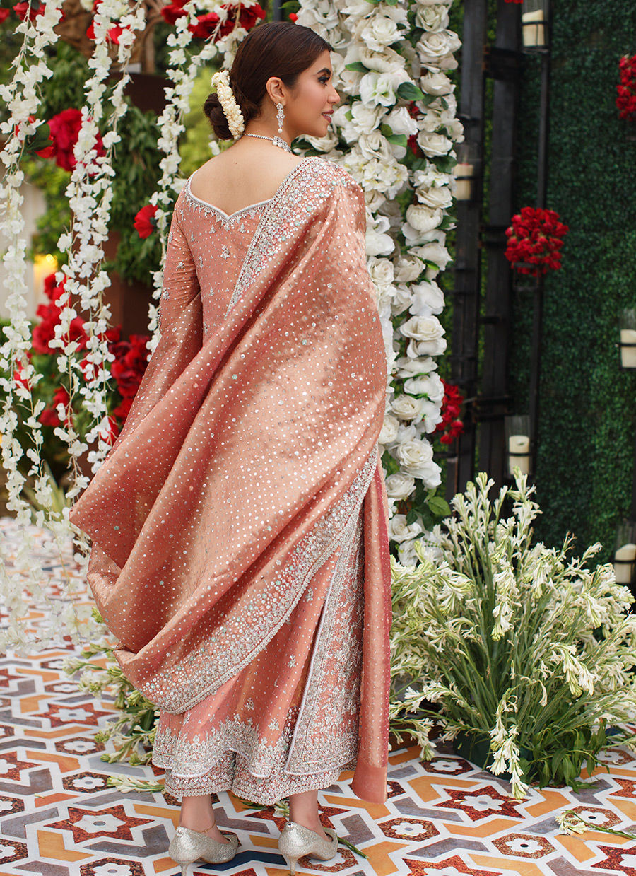 To enhance the look of the outfit, the izaar has a heavy border that complements the shirt. The heavy border is embellished with silver Kora, dabka, silk thread work and Swarovski crystals. The dupatta of this timeless piece is made of pure tissue which gives it an enticing sheen. Accentuated by a heavy border and densely sprayed with sequins Swarovski crystals to amplify the breath-taking beauty of the entire outfit.