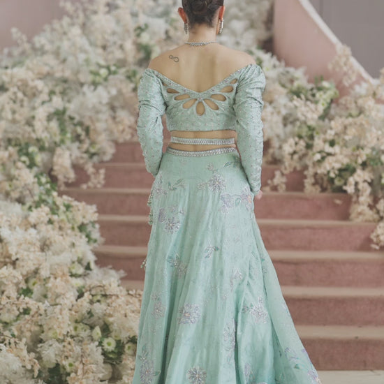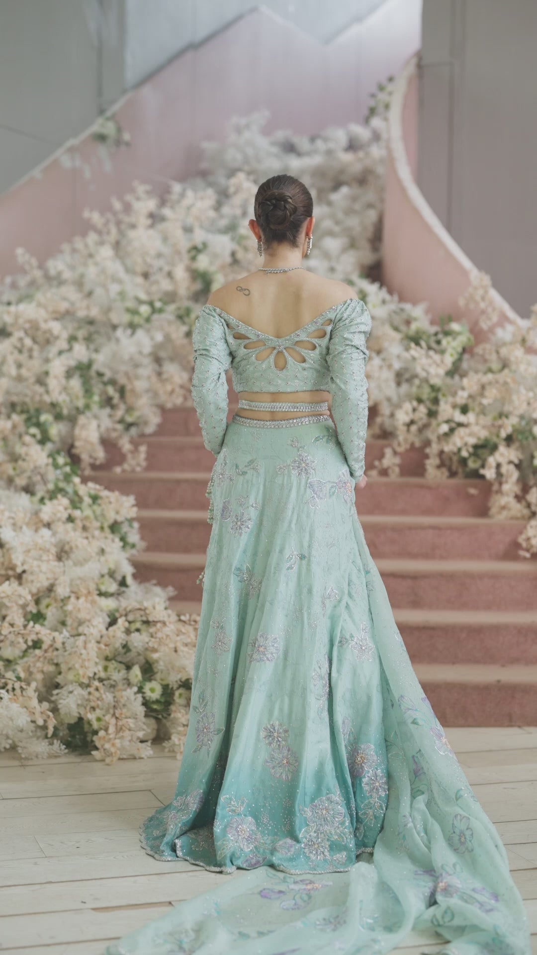 A striking blend of contemporary flair and traditional craftsmanship, this pale aqua three-piece ensemble is crafted from pure raw silk and organza, brought to life with detailing and exquisite hand Embellished in a myriad of vibrant hues.