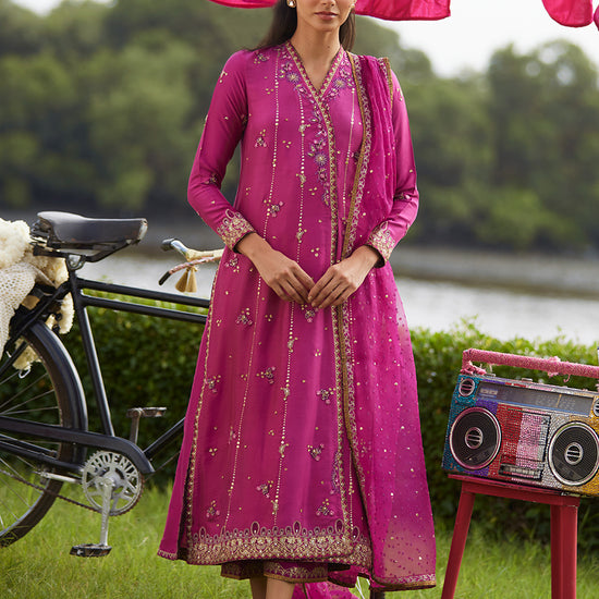 Bold, radiant, and unapologetically festive — this fuchsia pink raw silk angharkha is a celebration of timeless craftsmanship and modern allure. Adorned with intricate embroidery and delicate handwork, the silhouette flows effortlessly, exuding easy sophistication. Paired with classic raw silk izaar pants and a beautifully embroidered organza dupatta, this ensemble captures the essence of elevated occasion dressing — refined yet full of joy.