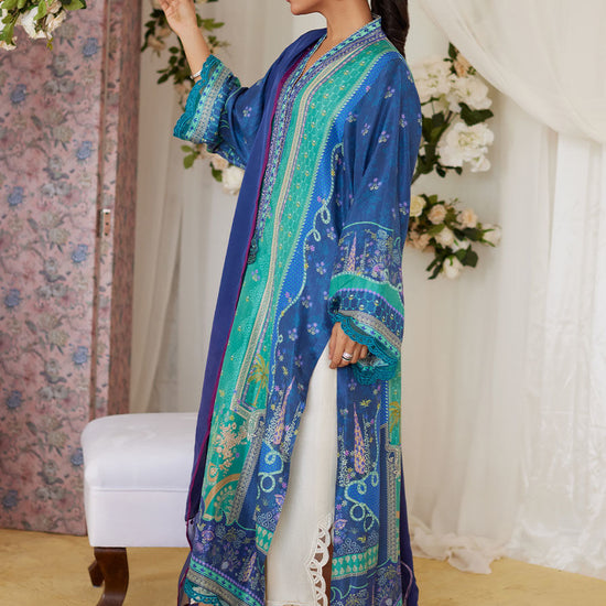 The captivating colour palette of this outfit makes it your ultimate solution to all occasions, big or small. Cut from pure raw silk boasting a luxurious fall the vibrant emerald green and lapis blue printed shirt is adorned with embroidery on the neckline and sleeves. The pure medium silk dupatta edged with organza makes this an inevitable show stopper. Pair with our pure raw silk izaar pants as shown for an unforgettable look!