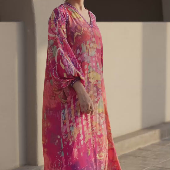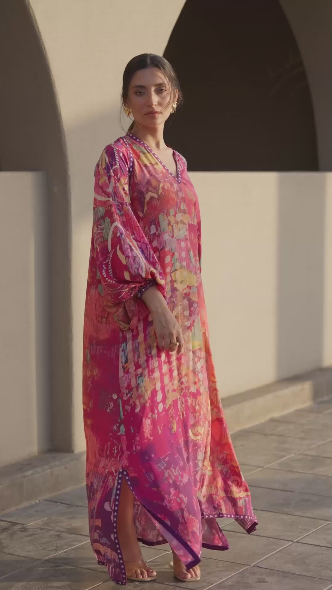Rendered in bright vibrant tones, this kaftan is perfect for those who appreciate timeless elegance with thoughtful detailing.