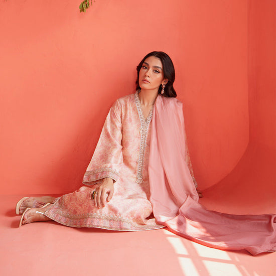 Cut from pure raw silk Mona Blush is inspired by a chunri pattern in shades of soft peach and seashell pink. The print is adorned with a richly hand embroidered neckline and sleeves, with delightfully dreamy pearl accents. The universally flattering, kurta silhouette is perfect for any manner of occasion.