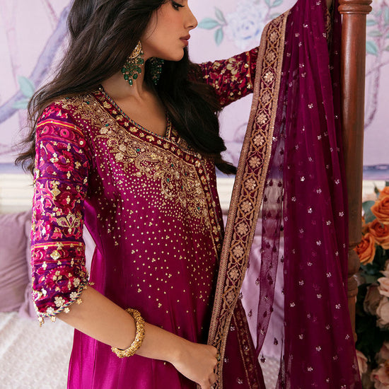 This magenta angharka ensemble gives classic glitz a fresh new look by combining the color of the season with one of our most loved silhouettes.