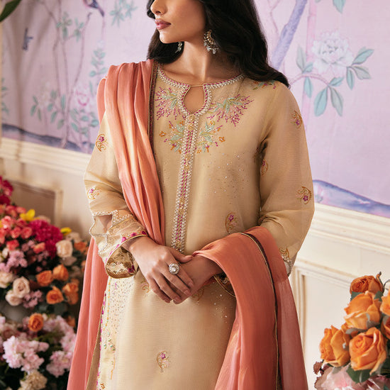 A two-tone pink ombre dupatta completes the ensemble. Pair with our pure silk shalwar (as shown) for an unforgettable look.