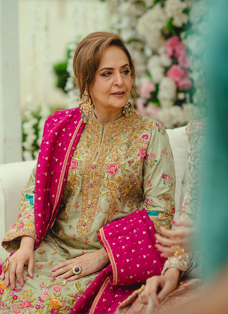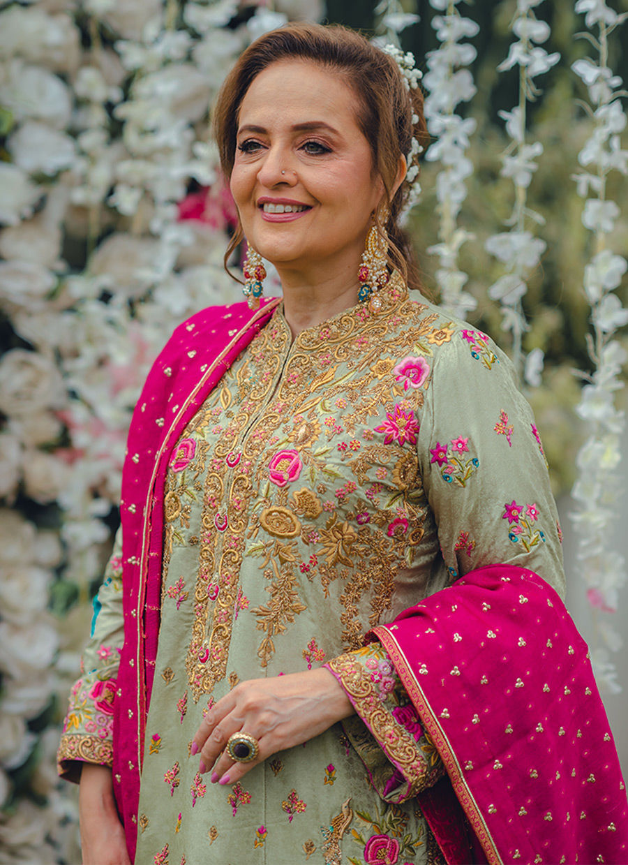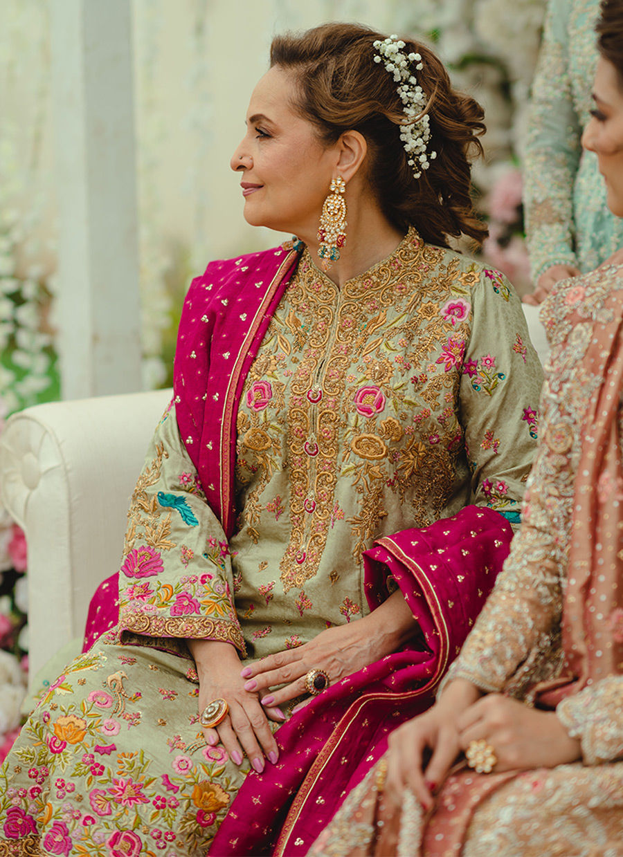 This outstanding shirt is embellished with tila, zari, dabka, naqseh, sequence, resham thread hand work in vibrant hues including lavender, mustard, green, light and dark ferozi, multiple shades of pink and Swarovski crystals to give it the perfect sheen. To further enhance the beauty of the shirt we have added floral trellis, floral booties, playful and vibrant birds and peacocks. The back of this exquisite piece has booties which make it heavy and eye catching. To complement with this shirt, we have added sage green pants in pure silk. This breath-taking shirt is paired with a magenta Cotton net duppata embellished with booties.