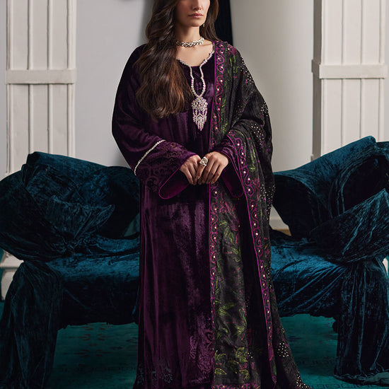 The Nensi kurta is a stunning piece, crafted from rich, sumptuous velvet that provides both comfort and elegance. Its deep wine hue creates a striking contrast against the subtle printed shawl. Adorning the kurta are delicate handworked details in gold and silver, adding a luxurious touch. The glimmering embroidery breaths life into the ensemble, providing a subtle sparkle that catches the light.