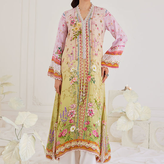 Infused with the signature FTA aesthetic, our new prints have the perfect pastel hues to make your heart skip a beat!! Cut from light breathable crepe, the kaftan is given a striking ombre treatment, with a gorgeous petal pink that flows seamlessly into an irresistible green hue. Whimsical florals bloom daintily all over the shirt, making this an absolute must have. The relaxed, much loved silhouette has a universally flattering neckline, adorned with delicate hand-made floral motifs, pearls and sequins, add an easy timeless elegance.