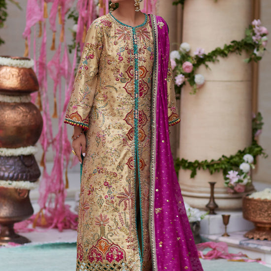 Nilan redefines classic elegance with a modern twist. The centerpiece is a Lame jacket, boasting a flattering front-open silhouette. Hand-embroidered resham and zardosi embellishments in contrasting hues dance across the emerald canvas, adding a touch of magic.the jacket is composed with a multitude of contemporary motifs made with intricate hand work and has an array of complementing colored appliques all over. Completing the ensemble is a pure silk jamawar straight pant. This luxurious outfit, featuring captivating patterns, whispers stories of heritage. The ensemble comes with a pure cotton net magenta dupatta with sitara chann all over and a border which gives it a finished look. Let Nilan be your statement piece, blending classic style with contemporary details.