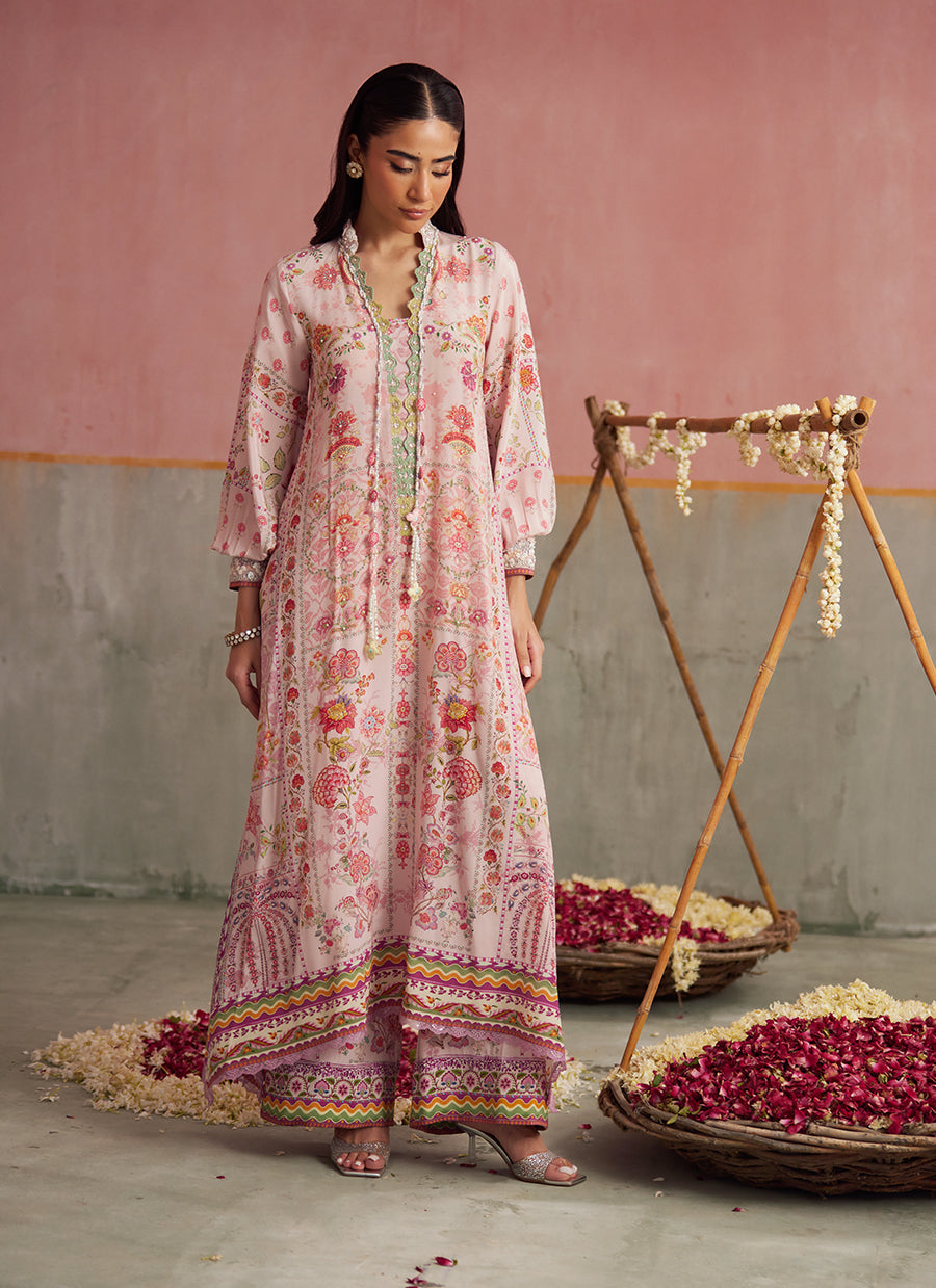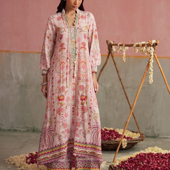 Turn heads in this statement-making blush pink crepe ensemble — a bold fusion of dreamy florals and modern glamour. The flowing silhouette moves with effortless grace, while the scalloped neckline, hand-embellished with pearls, strikes a delicate yet striking note. Voluminous sleeves with embroidered cuffs add drama, and the ankle-grazing length ensures a look that’s both laidback and unforgettable.