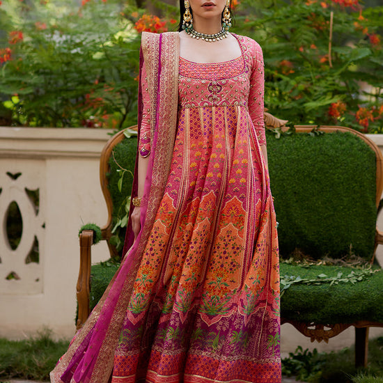 The round neckline, elbow length sleeves and bodice are intricately handworked with glimmering gold gota, nakshi, sequins and dabka. The kalis cascade down from the heavily worked bodice adding graceful movement and that unforgettable drama.
