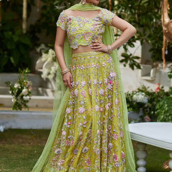 Definitely a color to own this festive season. A stunning kiwi choli featuring a multitude of complementing colors is a masterpiece of handwork, adorned with sitara, French knots, dabka, and threadwork across its entirety. The ensemble features a lehenga with organza panels with intricate embellishments which enhance the richness and allure of the lehenga, making it a focal point of the outfit. Completing the ensemble is a fresh green net dupatta, embellished with heavy all-over sitara chann for a shimmering effect. The dupatta is bordered with zari detailing all around, adding a luxurious touch. It is finished with vibrant tassels on the corners, adding a playful and festive flair to the overall look. This ensemble is a perfect blend of traditional craftsmanship and contemporary design, ideal for making a statement at any celebratory occasion.