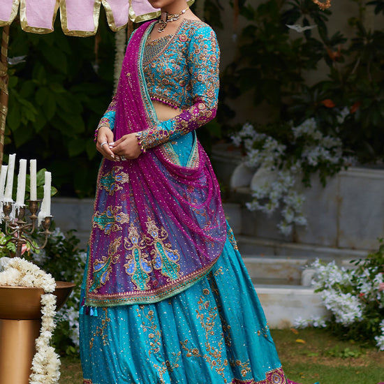 The stunning deep teal choli is a masterpiece with hand worked floral jaal and magenta appliques that are adorned with sitara, French knots, dabka, and threadwork across its entirety. This intricate embellishment enhances the richness and allure of the choli, making it a focal point of the outfit. Completing the ensemble is a magenta pure net dupatta, embellished with heavy all-over sitara chann for a shimmering effect. The dupatta is bordered with zari detailing all around including hand embellished baroque motifs on the corners adding a luxurious touch. It is finished with a pure katan silk lehenga with magenta appliqued border that adds a playful and festive flair to the overall look. This ensemble is a perfect blend of traditional craftsmanship and contemporary design, ideal for making a statement at any celebratory occasion.