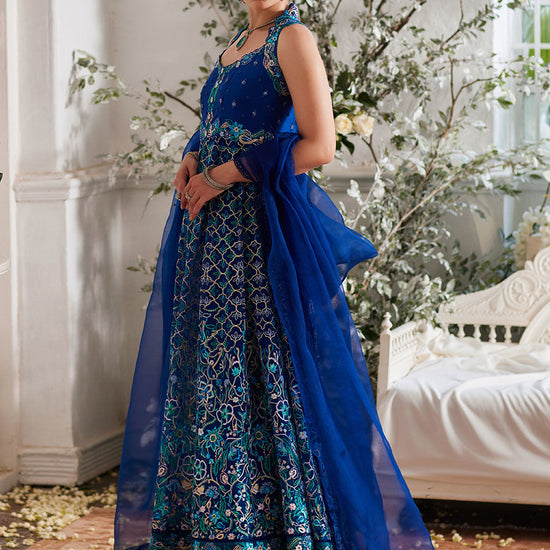 An ink blue high-necked halter kalidaar, beautifully crafted with intricate embroidery details and hand embellishments with subtly shimmering sequins and Swarovski crystals. The pure raw silk bodice is gorgeously hand worked with silk thread work in cool tones and subtly shimmering sequins. Cascading down from the bodice are organza panels with a richly embroidered floral trellis making this one the ultimate show stopper.