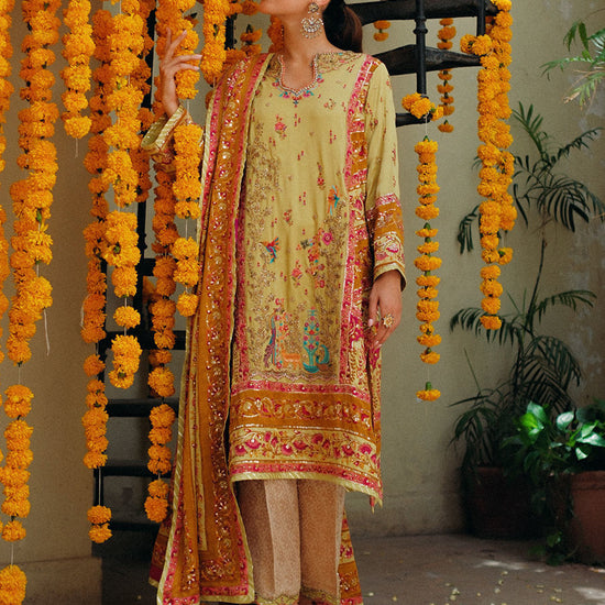 A kiwi hand blocked kurta adorned with intricate single dhaagha aari work, zardozi, and sitara chann, creating a rich tapestry of textures and embellishments. The kurta's detailing adds a luxurious and traditional touch, making it a standout piece for festive occasions. The kurta is paired with a gold hand blocked straight pants, elegantly finished with a kiwi applique, which complements the kurta's color scheme and adds a sophisticated contrast. Completing the ensemble is a hand blocked dupatta in shades of pink and mustard, adorned with intricate handwork all over. The dupatta enhances the overall look with its vibrant colors and detailed craftsmanship, adding a touch of elegance and completing the ensemble with finesse. This ensemble is perfect for any age and especially those who appreciate traditional craftsmanship and contemporary design elements, offering a sophisticated and stylish look for special celebrations