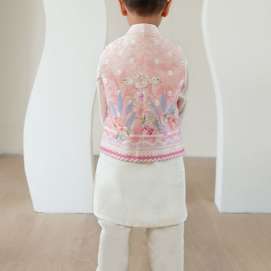 Overflowing with signature FTA charm, this season’s prints arrive in dreamy pastels that are sure to delight. Crafted from luxurious raw silk, this waistcoat features delicate, whimsical florals scattered across a soft, elegant canvas—bringing a sense of playfulness and sophistication in equal measure. With its easy, relaxed fit and graceful tailoring, it’s perfectly styled over a classic plain shalwar kameez. This piece adds an effortlessly polished touch to any young boy’s look, blending timeless tradition with a hint of fresh, youthful flair.