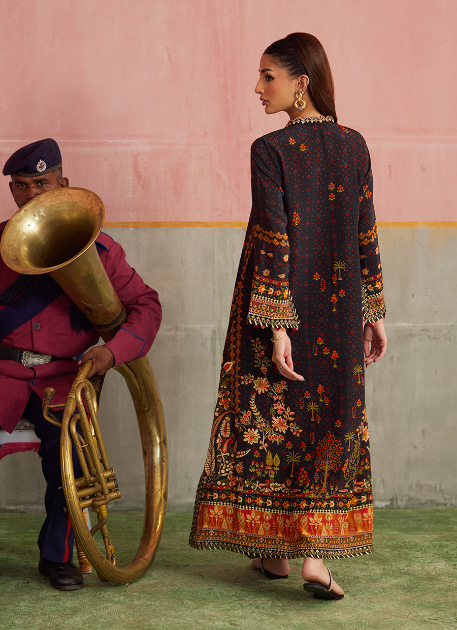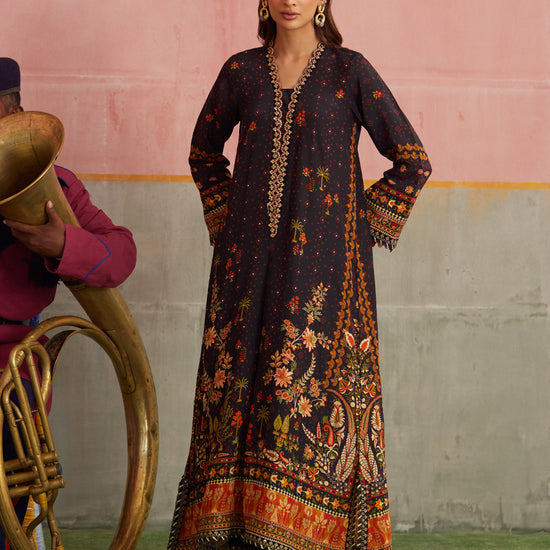 A contemporary take on classic elegance — this fluid crepe kaftan shirt in a striking ebony hue, offset with vibrant crimson and burnt orange, shimmers with hand embellished Swarovski crystals and resham detailing, for the slightest hint of tradition. Wear yours with our pure raw silk izaar for the perfect balance between ease and sophistication.