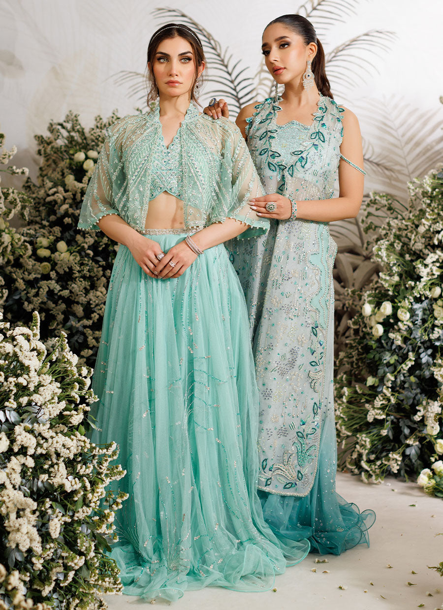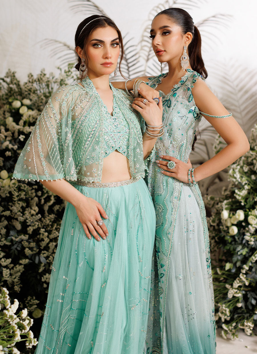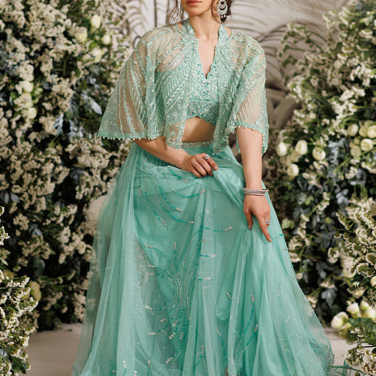 A mesmerizing cape cut from pure organza in a pale mint hue is meticulously hand embellished with kora, dabka, pearls and Swarovski crystals in an art deco inspired linear composition.