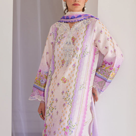 This ensemble features a soft lavender raw silk shirt, brought to life with delicate floral prints in hues of pink, lavender, and green—a fresh, botanical dream. The relaxed, universally flattering silhouette is enhanced by a graceful neckline, adorned with hand-crafted floral motifs made of pearls and sequins for just the right hint of sparkle.