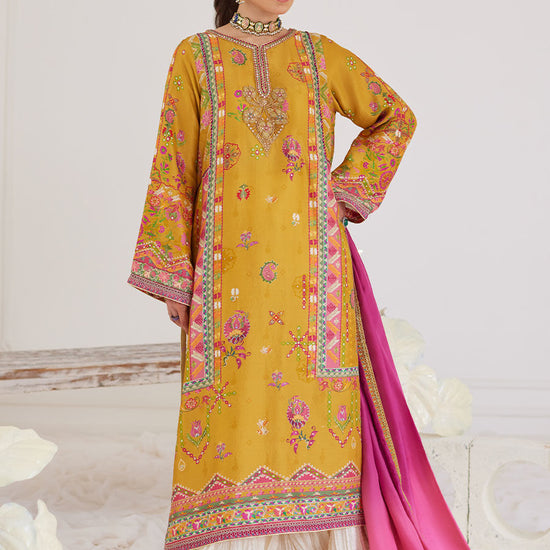 The elegant, flowing shirt is paired with a pure medium silk dupatta in shades of magenta, trimmed with gold embroidered and bright printed borders.