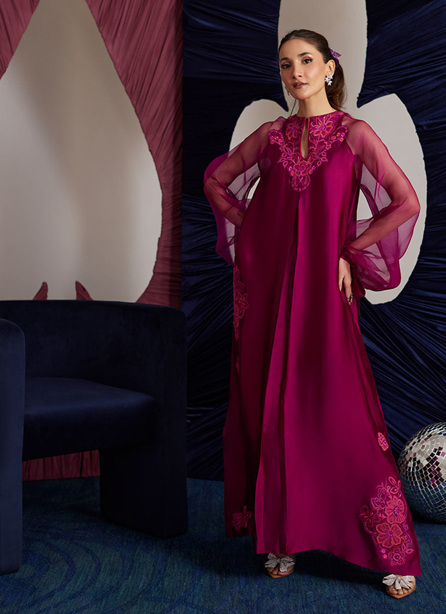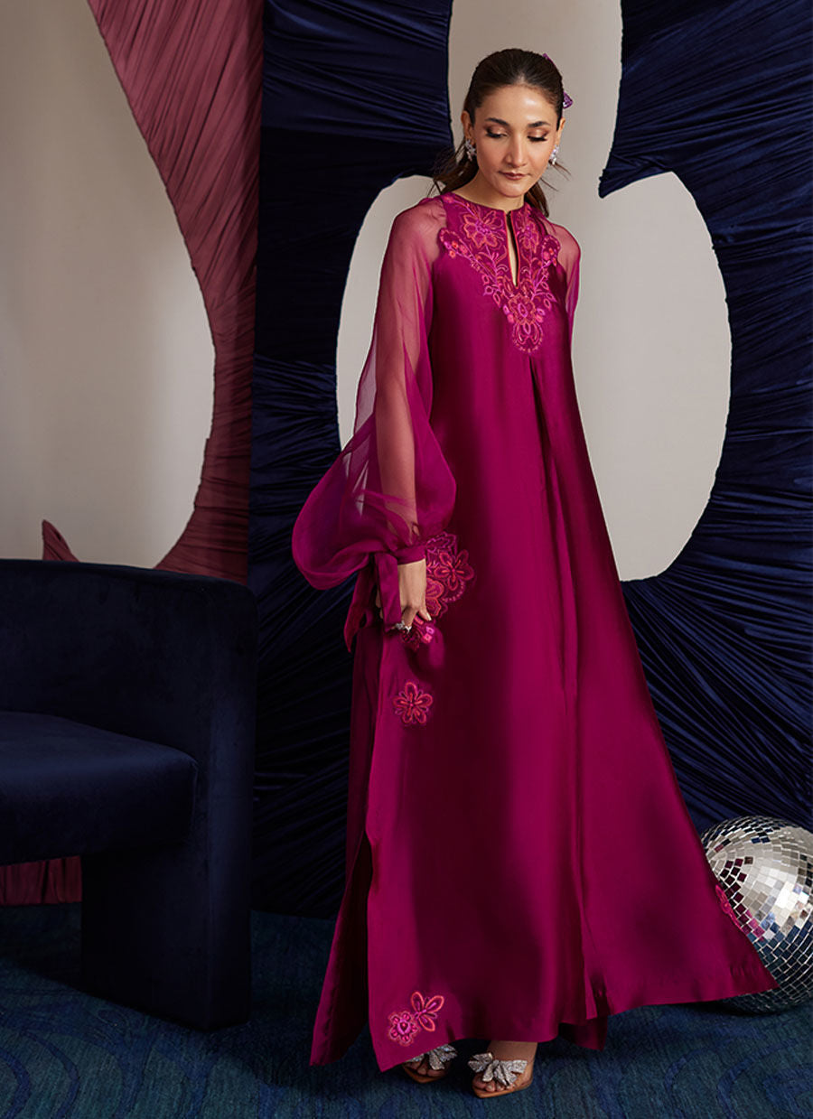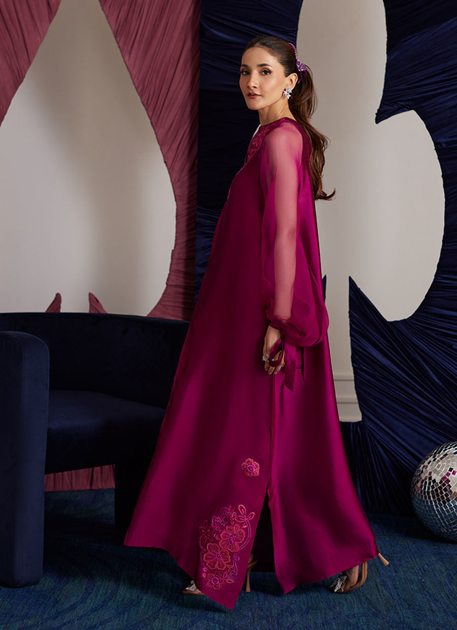 This magenta Sheesha Silk shirt is a stunning embodiment of contemporary elegance, seamlessly blending classical romance with modern flair. The shirt flows gracefully, adorned with delicate floral appliqués that add a soft, feminine touch, while meticulous embroidered details weave through the fabric, creating intricate patterns that enhance the shirt’s luxurious appeal. The statement balloon sleeves, tied with ribbons and bows, bring a dramatic, yet playful dimension to the design, adding volume and a sense of grandeur. Paired with a pure raw silk izaar, this ensemble strikes the perfect balance between elegant and eye-catching, making it an exceptional choice if you’re looking to make an entrance!!