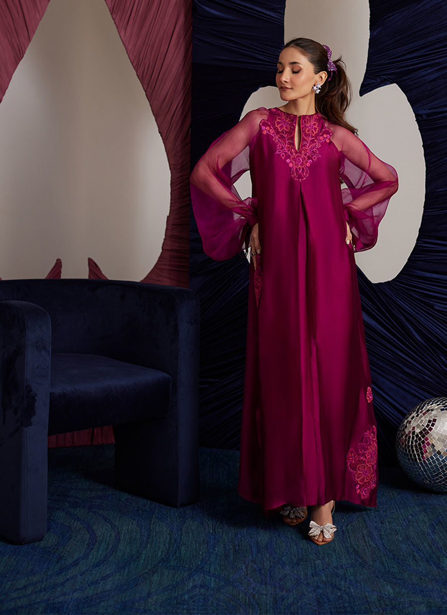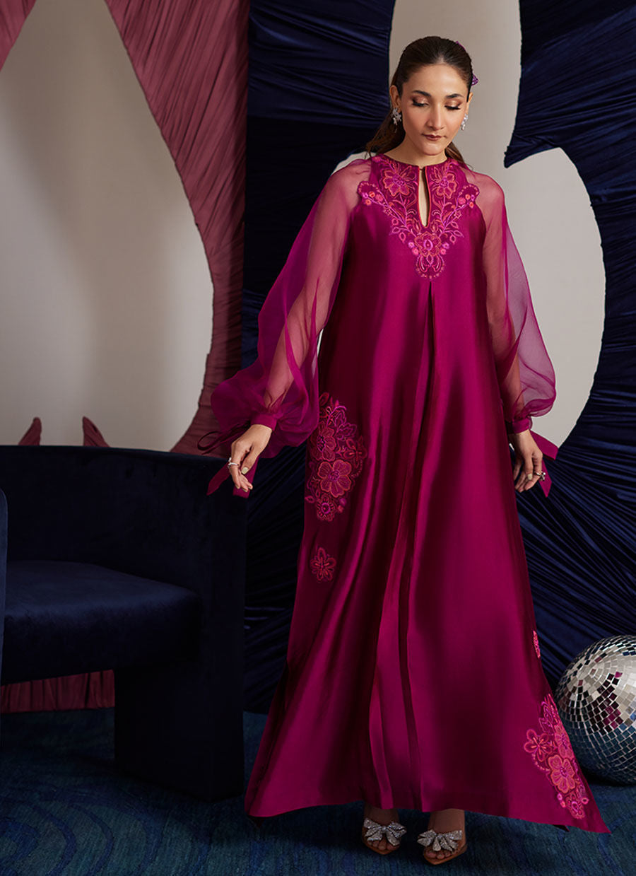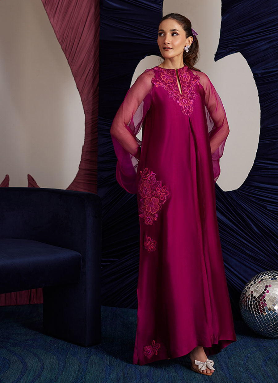 This magenta Sheesha Silk shirt is a stunning embodiment of contemporary elegance, seamlessly blending classical romance with modern flair. The shirt flows gracefully, adorned with delicate floral appliqués that add a soft, feminine touch, while meticulous embroidered details weave through the fabric, creating intricate patterns that enhance the shirt’s luxurious appeal. The statement balloon sleeves, tied with ribbons and bows, bring a dramatic, yet playful dimension to the design, adding volume and a sense of grandeur. Paired with a pure raw silk izaar, this ensemble strikes the perfect balance between elegant and eye-catching, making it an exceptional choice if you’re looking to make an entrance!!