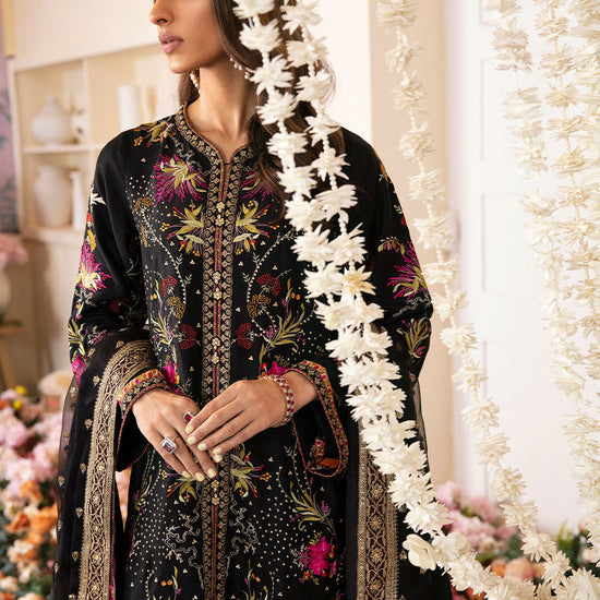 A canvas of deep, dreamy onyx is adorned with stunning composed embroidery in vibrant tones. Delicate florals bloom along the neckline, daaman and sleeves, with hand embellished gold motifs further uplifting the shirt.