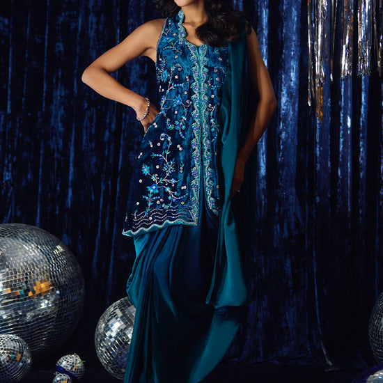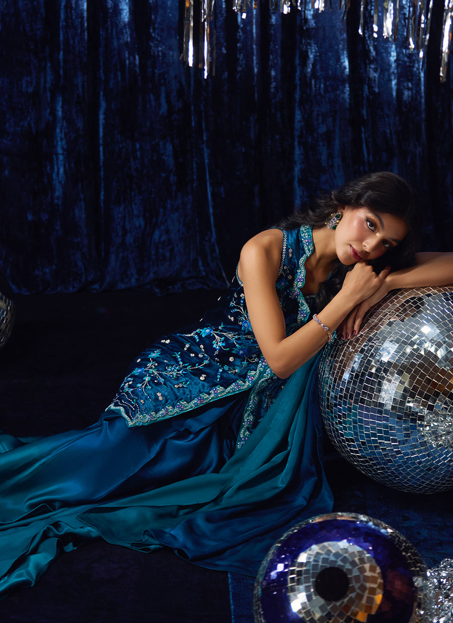An effortlessly elegant statement — this Prussian blue and sea green velvet jacket is adorned with intricate resham and zardozi handwork, creating a captivating interplay of colour and craftsmanship. The jacket’s rich tones transition beautifully into the fluid grace of a dip-dyed charmeuse silk sari skirt, adding a modern twist to a timeless silhouette. Perfect for evening soirées and festive occasions, this ensemble strikes the perfect balance between sophistication and glamour.