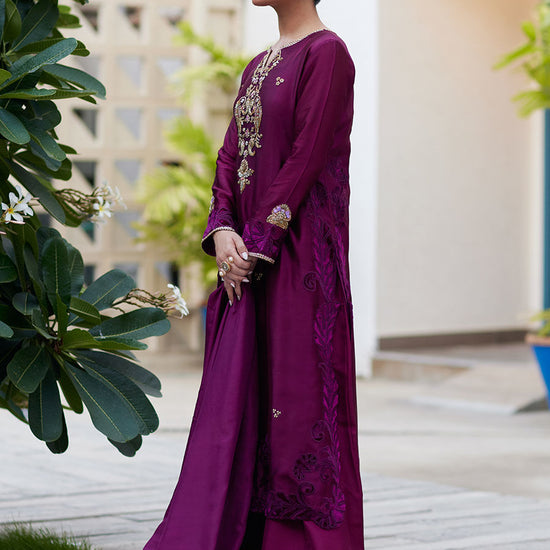 Adorned with intricate golden dhabka work and swaroski on the neckline and sleeves.