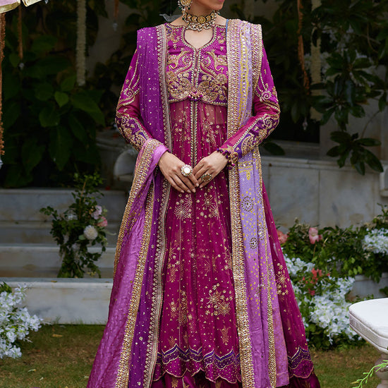 The meticulously selected unique shade of magenta is the festive color of the season. The voluminous kalidaar that has an appliqued daaman comes with a high front slit which ultimately makes it the most flattering silhouette. The pure cotton net shirt is beautifully embellished with intricate gold zardozi, dabka, sequins, and silver zari, naqshi, gota. This elegant kalidaar is complemented with a charmeuse block printed lehenga. The exceptionally beautiful ensemble is an absolute showstopper. The dupatta featured with it is a hand embellished chunri chaddar along with an embellished pure net dupatta which gives the dress a fancy finish that will no doubt leave everyone amazed. The perfect combination of colors makes it a unique outfit which will give the bride a gorgeously royal look