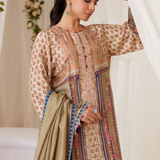Don’t miss out on the timeless elegance and unmatched versatility of our Reen ensemble. Cut from pure raw silk the shirt is a gorgeous sandy hue with an exclusively designed FTA digital print and embroidery on the neckline and sleeves. The accompanying pure medium silk dupatta with stunning embroidered borders completes your ensemble. Eternally stylish, irresistible details will make this one of your smartest buys this season!