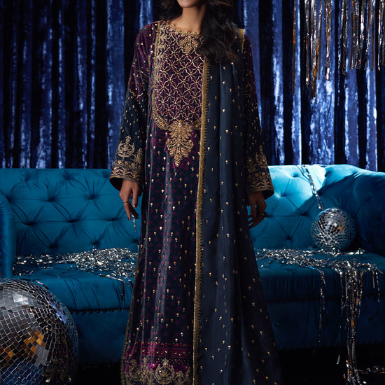 This printed velvet ensemble blends warmth with easy sophistication. The rich velvet canvas is adorned with intricate bronze zari embroidery, shimmering sequins, delicate nakshi, and hand-set stones, creating a luxurious play of texture and light. The look is completed with a medium silk dupatta, beautifully embellished with sequins and framed with zari borders, and a pure raw silk izaar featuring matching zari accents.