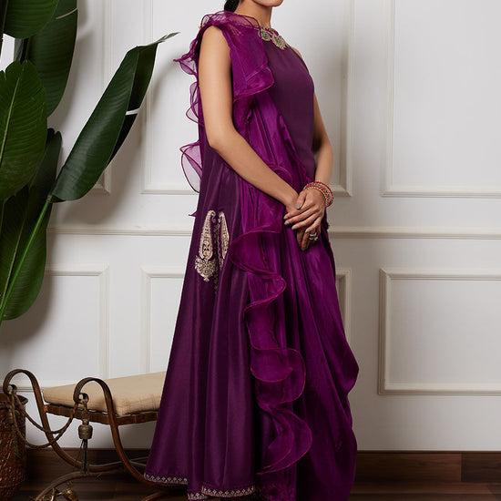 Cut from pure raw silk in a striking aubergine hue the impeccable tailoring and smooth flowing kalis of this ensemble will have you reaching for it whenever you really want to make an impact!