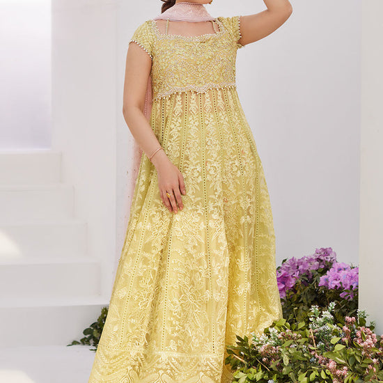 kiwi organza, the Reine ensemble strikes the perfect balance between elegant and eye-catching. This flowing kalidaar is richly embroidered with intricate, silk threadwork, while the bodice is further uplifted with silver and pearl hand embellishment and little pops of pale pink blooms. The cascading panels flow gracefully bringing irresistible movement to the ensemble.