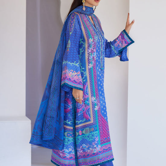 The gorgeous, digitally printed, pure silk dupatta in tonal blue detailing adds a graceful flair.