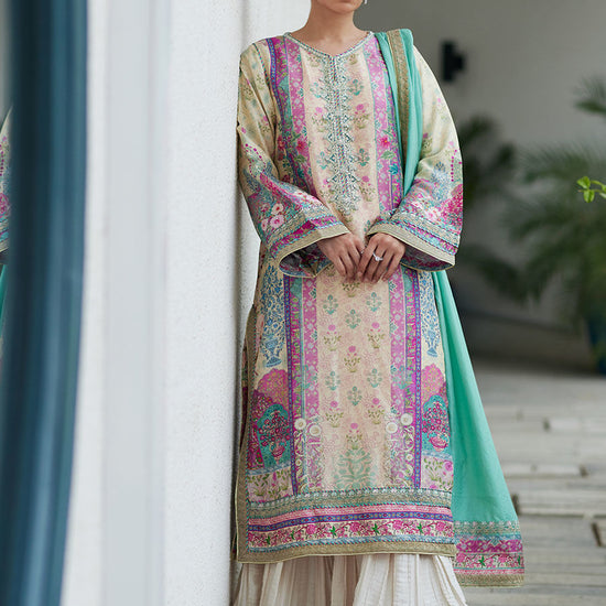 An aqua pure medium silk dupatta with print detailing completes your ensemble for a stand out look.