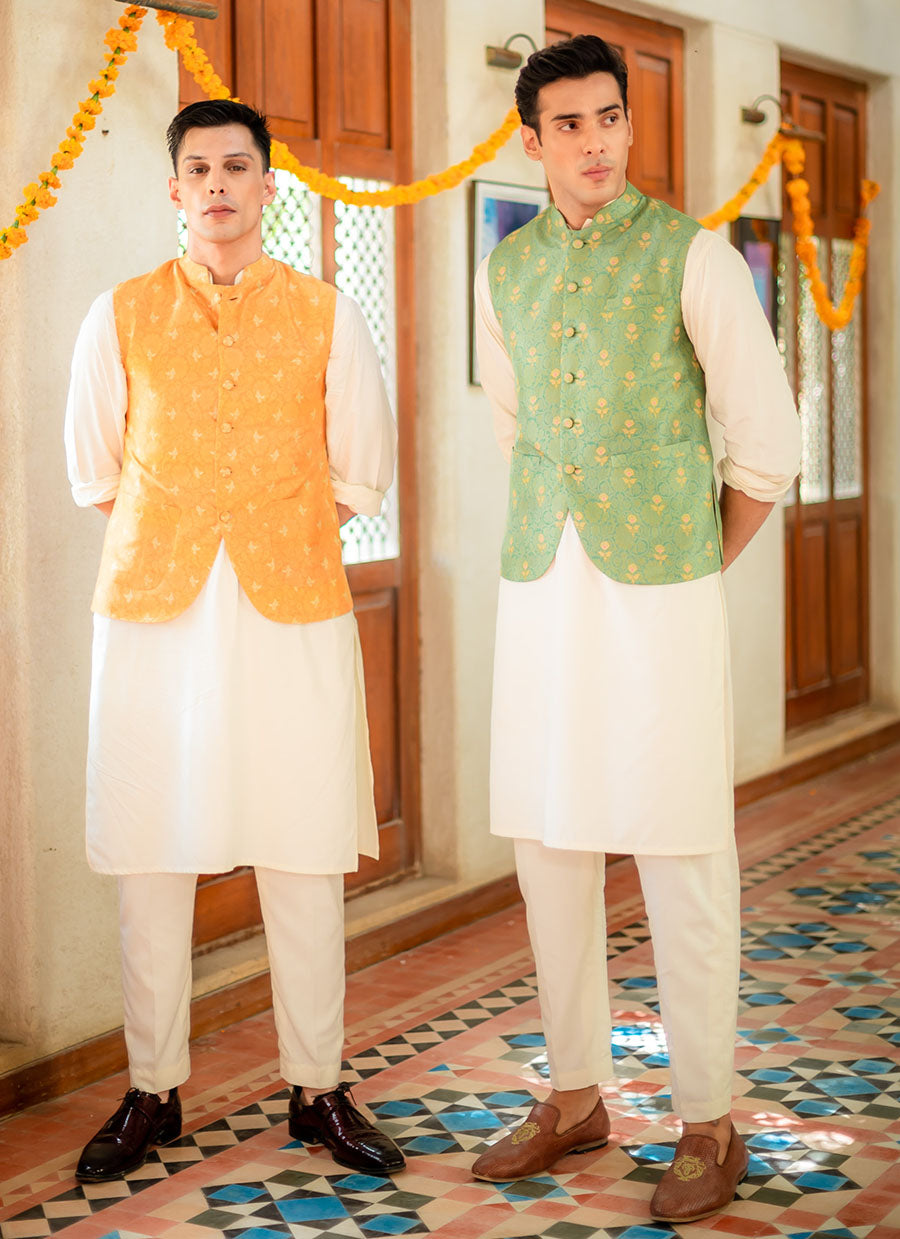 Pair with our digitally printed, pure raw silk waistcoat is a soothing avocado green hue, with the palest of yellow motifs, is layered over the kurta pajama, for a polished, dapper look.
