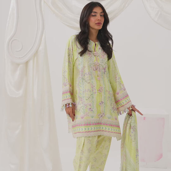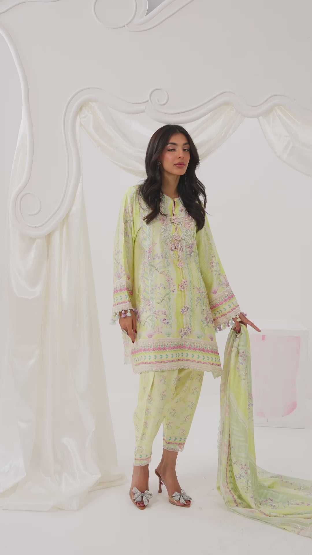 Paired with a printed raw silk khari shalwar for a statement finish and completed with a printed medium silk dupatta, this ensemble feels light, confident, and perfectly styled for elevated daytime wear. Designed for those who appreciate tradition with a modern twist, Riva is equal parts playful and refined.