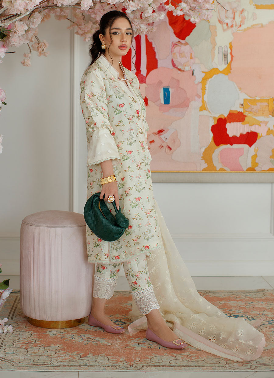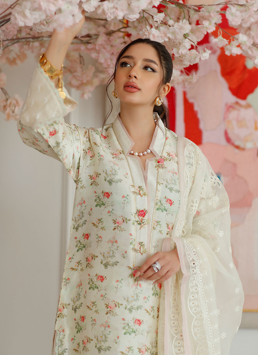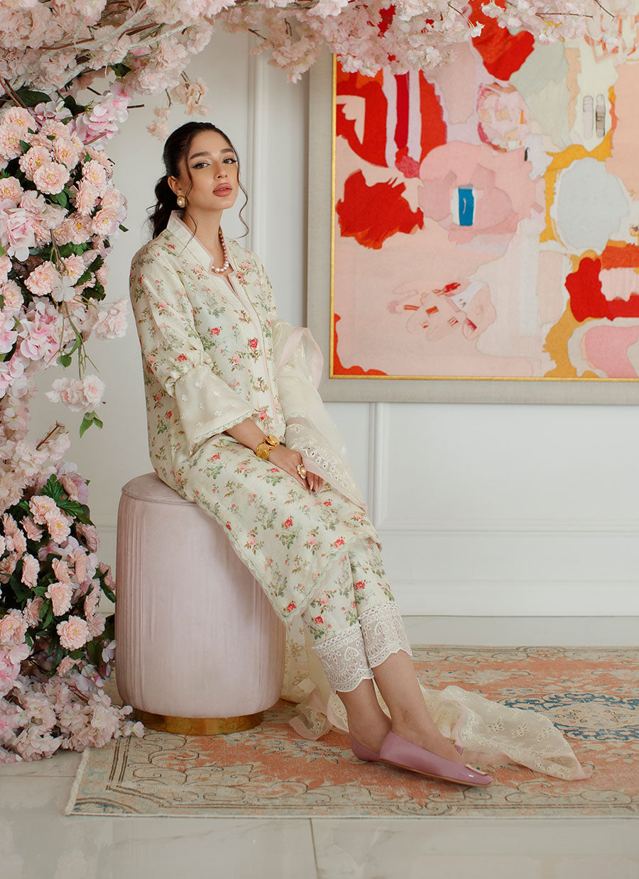 The elegant detailing on the neckline and the organza dupatta with eyelet embroidery make this floaty, feminine set even more charming.
