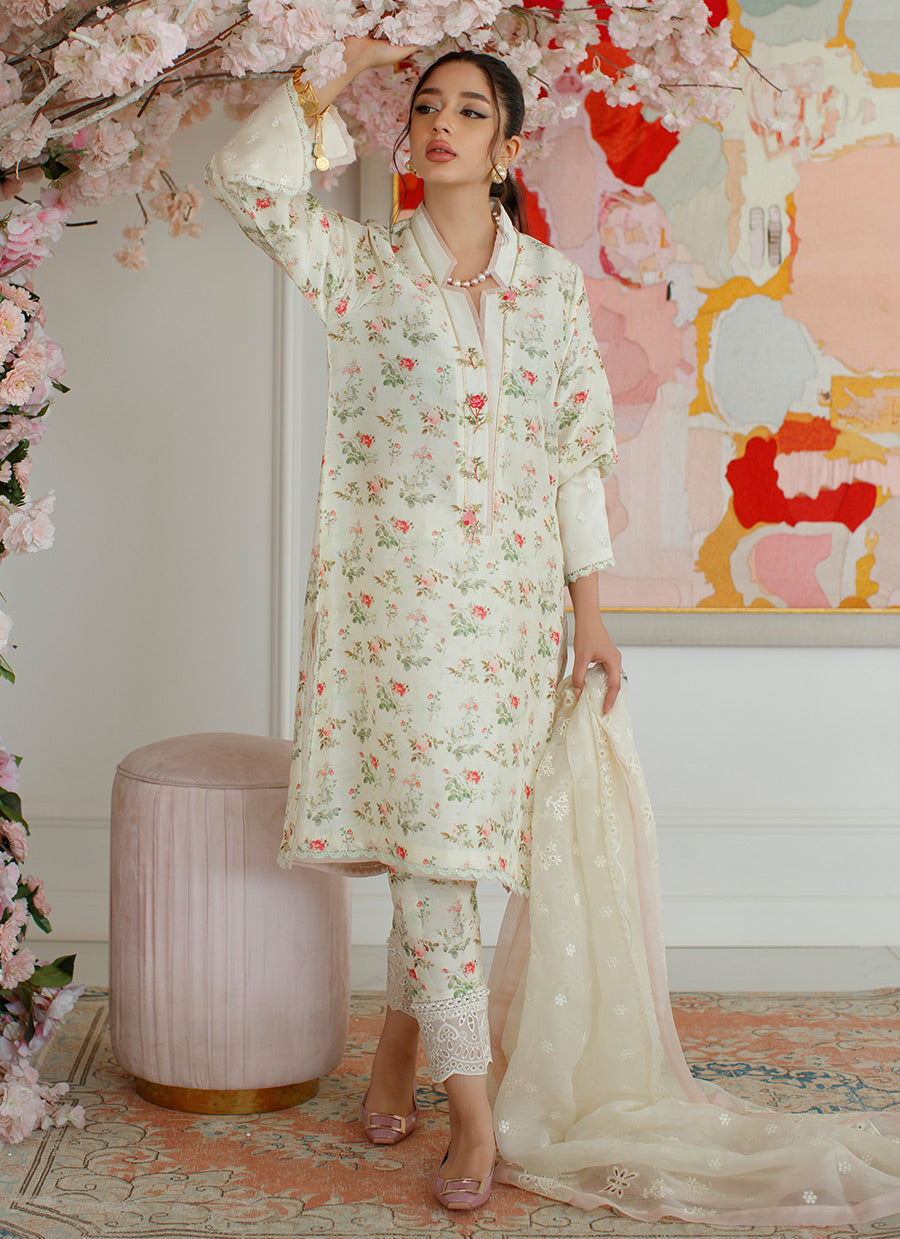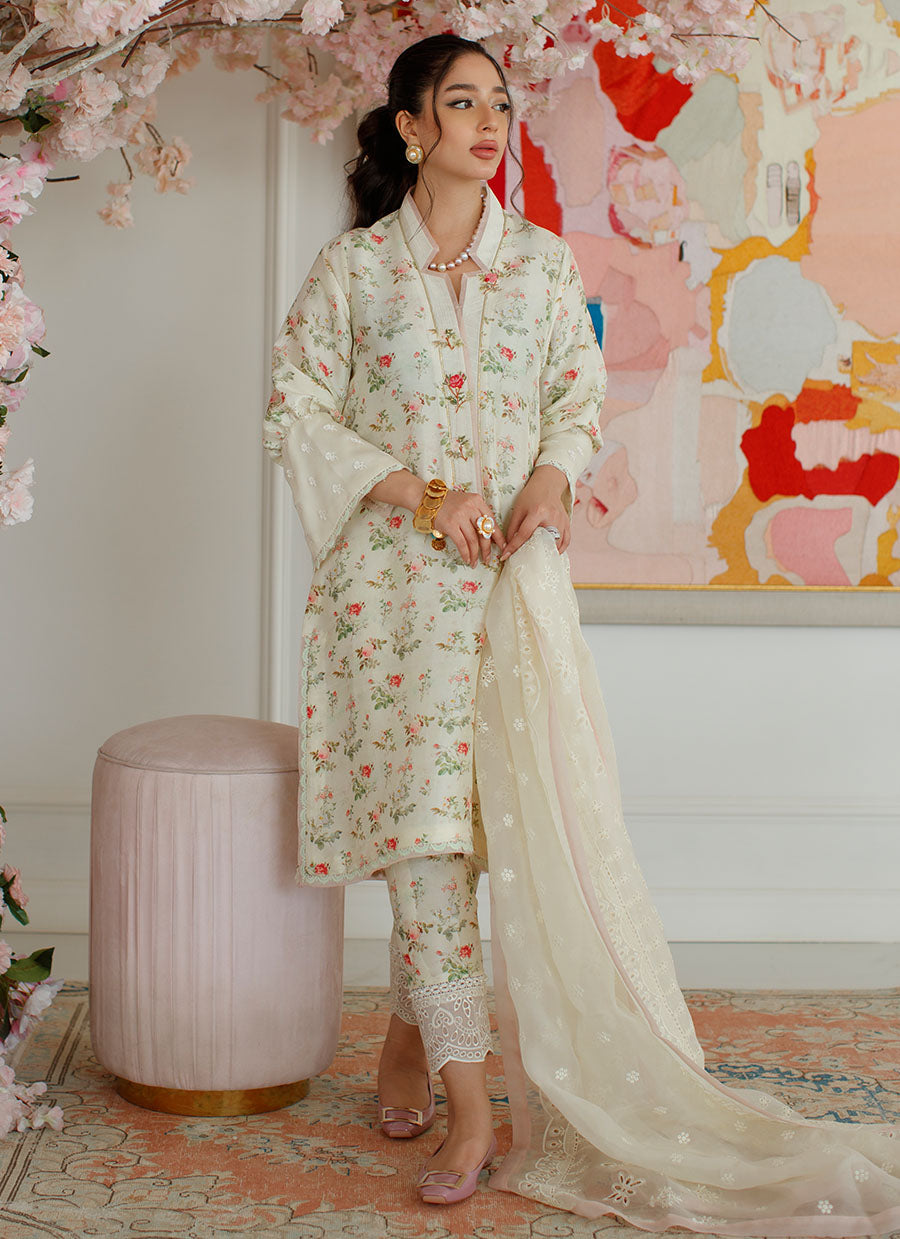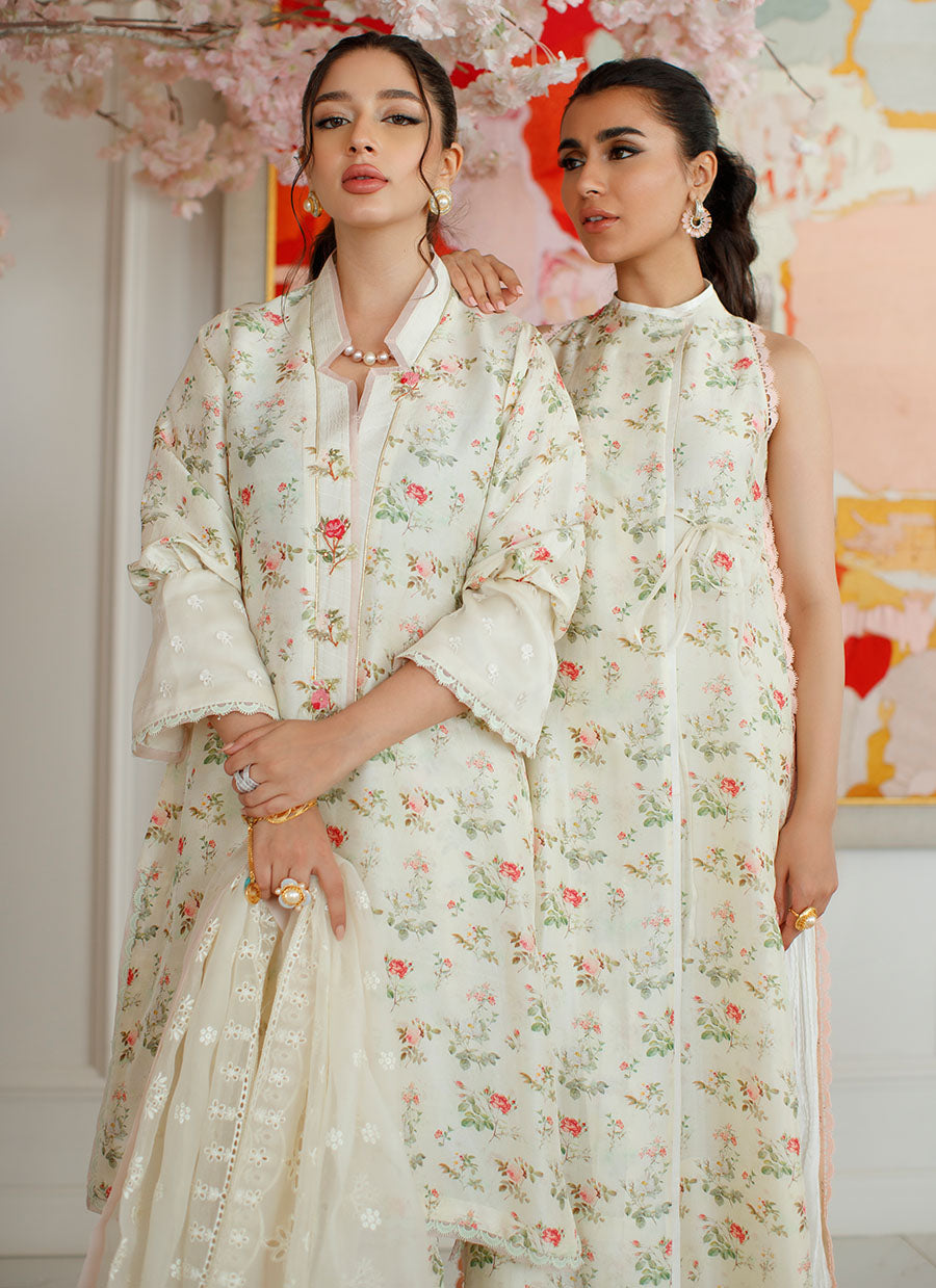 The elegant detailing on the neckline and the organza dupatta with eyelet embroidery make this floaty, feminine set even more charming.