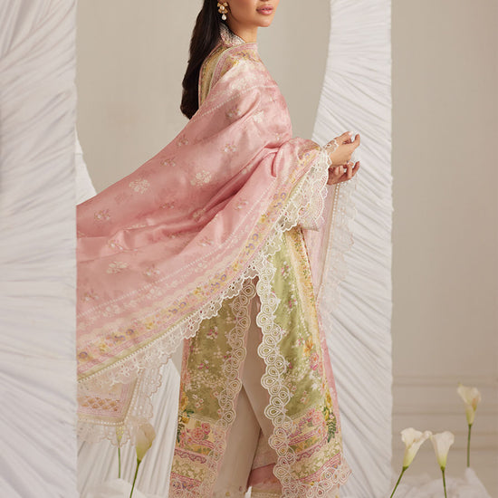 A pure medium silk dupatta with a coordinating print is trimmed with cut work borders to complete your ensemble.