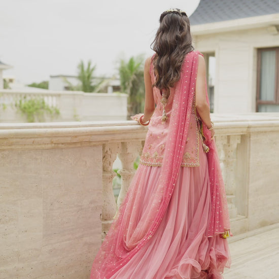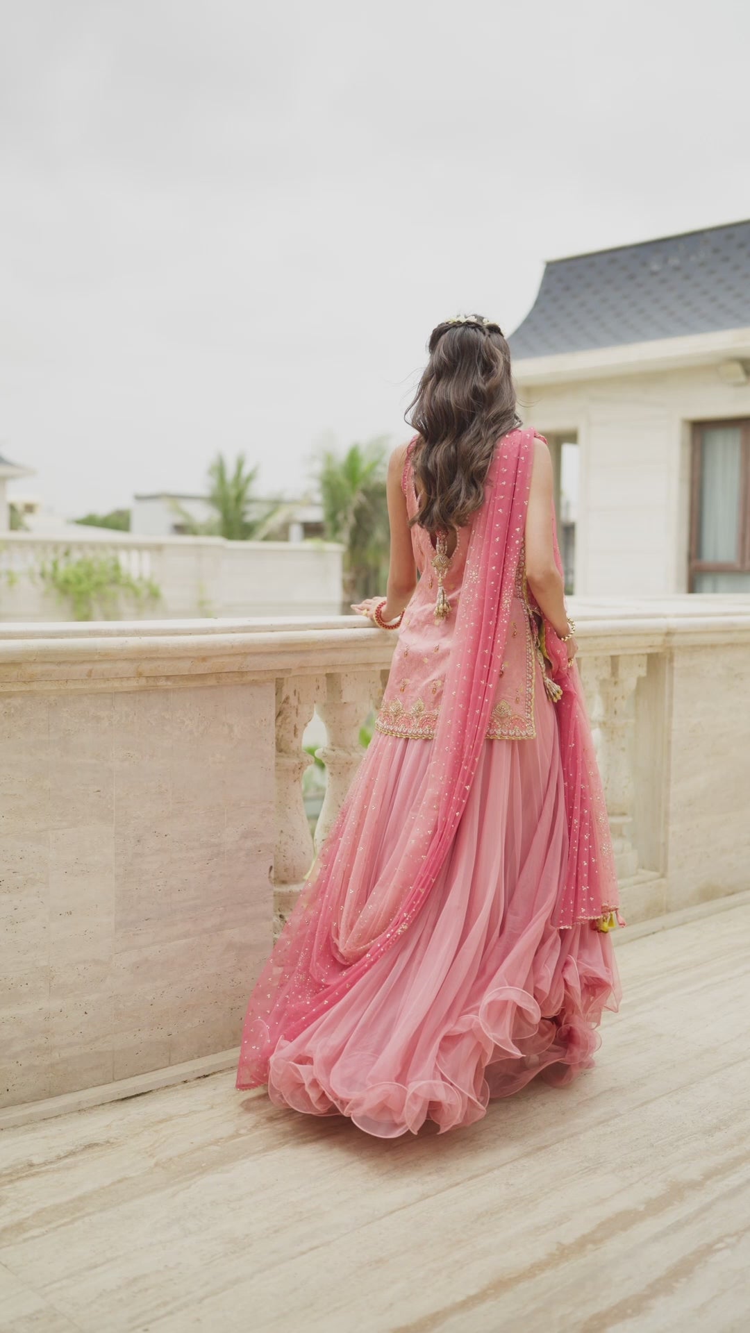 The very picture of refined elegance, with a joyous twist, this self-jamawar shirt is adorned with intricate kora, dabka, sequins, and crystals. Further elevated with delicate block-printed appliqué that adds richness and depth. The voluminous net dhaka pajama brings graceful movement to the silhouette, while the shaded dupatta—washed in soft ombré tones of pink—frames the look with feminine delicacy. Striking the perfect balance between traditional artistry and contemporary charm, this ensemble makes an effortless statement for celebratory occasions.