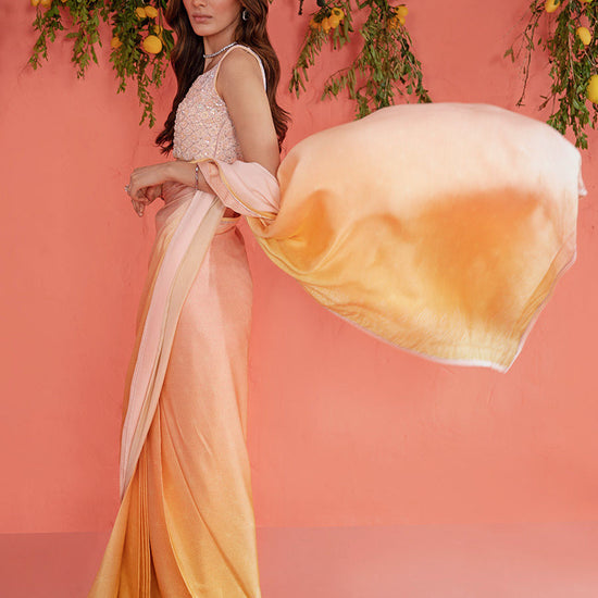 The nostalgic silhouette of a timeless saree is given a contemporary twist with a whimsical ombre digital print. A dainty peach hue flows seamlessly into a tangy lemon with a subtle chunri print, making the saree utterly gorgeous. The saree is paired with a sumptuous peach blouse, cut from pure raw silk. The blouse is fully hand worked with sequins and Swarovski crystals.