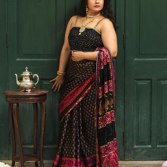 A Stunning charmeuse hand blocked black sari showcases a striking blend of shades with vibrant pink and orange accents. The pallu is the highlight, beautifully adorned with intricate cutwork and exquisite handwork details that include kora, dabka, and Swarovski stones, creating a mesmerizing and luxurious effect. Paired with the sari is a sleek black blouse featuring embellished straps, adding a contemporary touch to the traditional ensemble. The embellished straps on the blouse perfectly complement the detailed pallu, creating a cohesive and sophisticated look. This ensemble is perfect for evening events and special occasions, where the blend of vibrant colors, intricate handwork, and modern elements come together to create a stunning and unforgettable outfit.