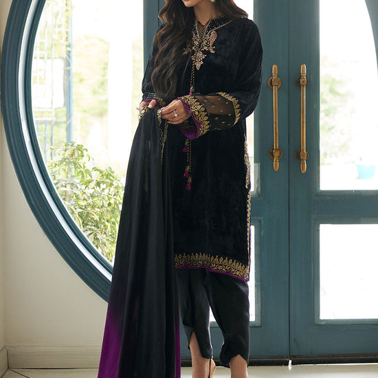 The Sabeel shirt is cut from plush onyx velvet and lavishly adorned with an intricately hand worked neckline, sleeves and daaman. Glimmering gold hand work at the flattering neckline has hints of emerald and amethyst silk thread work to provide a fun pop of colour.