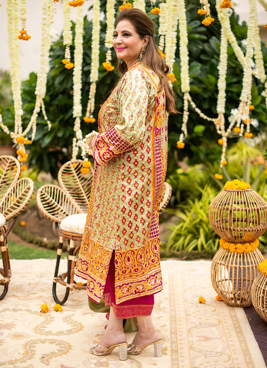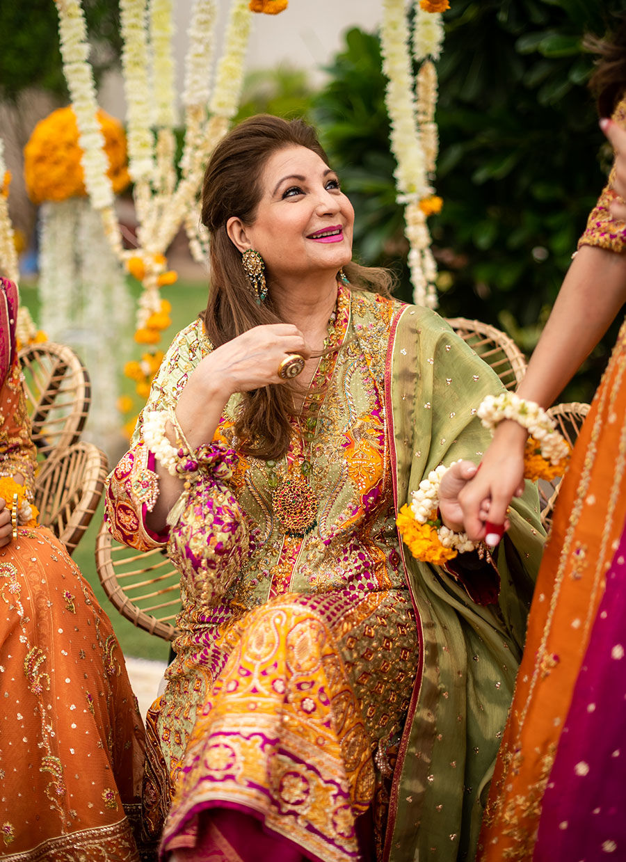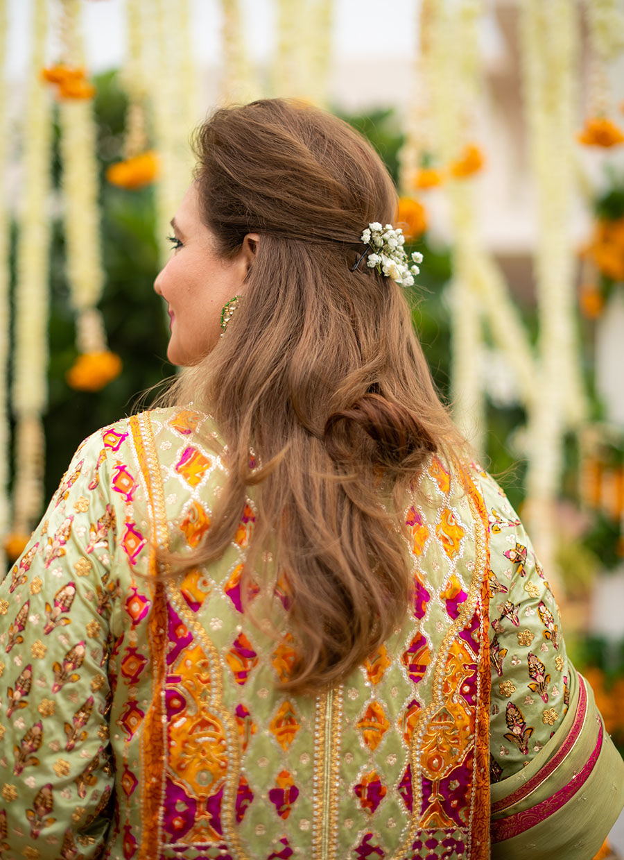 A myriad of colours on a mint green base with delicate floral embroideries as well as playful birds and intricate gota motifs. Appliqués of different festive shades on pure silk to enhance the zardozi, ari and thread work add a festive element to the outfit. A flattering cut with slits and a “tulput” neckline make this outfit easy to wear on every body type. The complementing soft tissue dupatta and heavily embellished izaar add to the regal look of the ensemble.