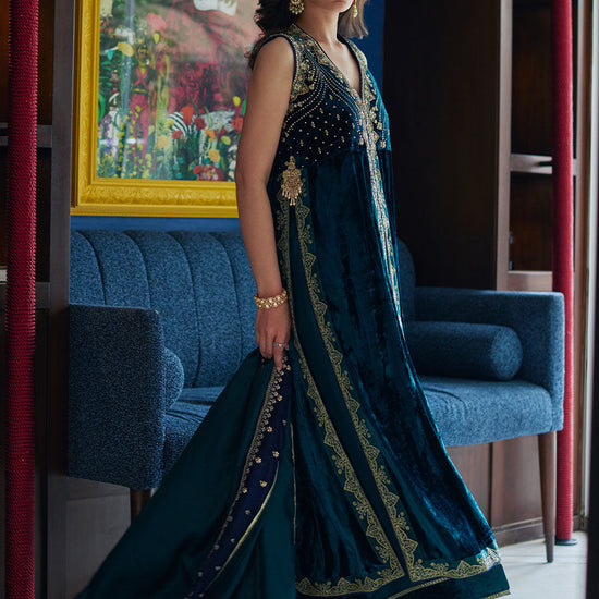 The Sahla shirt is cut from plush teal velvet and lavishly adorned with an elaborately hand-worked neckline. The bodice of the front open shirt is richly embroidered with shimmering gold sequins, applique and hand embellishments. The high side slits give an utterly entrancing look to this stunning shirt and the hand-made motifs catch the eye over and over.
