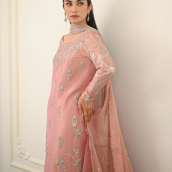 A touch of youthful charm unfolds in the form of light pink thread work that weaves its way throughout the kameez. This captivating interplay of colour creates a symphony of light and whimsy. Completing the Saiba masterpiece is a soft tissue dupatta, delicately adorned with gold zari work. Flowing effortlessly, it echoes the grace of the ensemble. The zari silk trousers, seamlessly harmonious with the kameez, create a vision of effortless elegance.