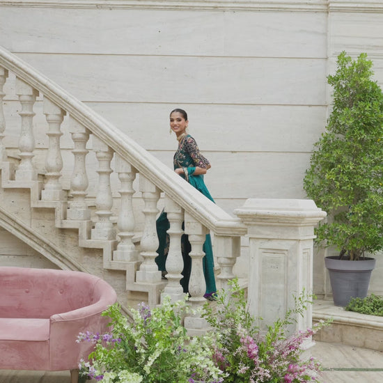 An ode to grandeur of times past, this teal kalidar captures the poetry of tradition in every detail. Jewel-toned appliqués and delicate handwork of kora, dabka, and resham embroidery dance across its flowing silhouette, while the self-jamawar sleeves shimmer with an intricate handworked jaal. A contrasting dark blue jamawar bustier peeks through, adding depth and quiet boldness. Paired with a net dhaka edged in an exquisitely embellished border and completed with a katan dupatta kissed with sequins, the ensemble is a study in timeless grace. Effortlessly regal, endlessly unforgettable.
