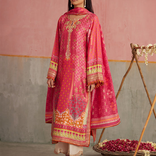 Radiant and brimming with unmissable elements, this hot pink digitally printed kurta brings a festive charm to any occasion. The neckline sparkles with a medley of intricate hand embellishments, while playful details finish the sleeves with incomparable finesse. A flowing, pure medium silk dupatta, adorned with an eye catching digital print completes the ensemble. Pair yours with our pure raw silk izaar for a look that strikes the perfect balance of vibrancy and chic versatility.