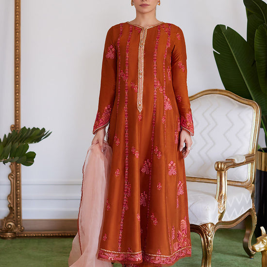 Seneera Embroidered Rust Raw Silk Kalidaar With Dupatta